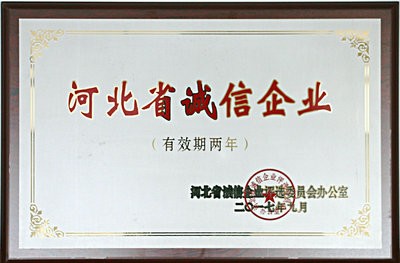 本網訊 近期,在河北省誠信企業評選委員會辦公室聯合河北省社會信用體系建設領導小組辦公室、河北省企業家協會和省直有關單位組織開展的2017年“河北省誠信企業”評選表彰活動中,經層層審核,我公司再次榮獲“河北省誠信企業”榮譽稱號,至此,我公司已連續6次榮獲此項榮譽。