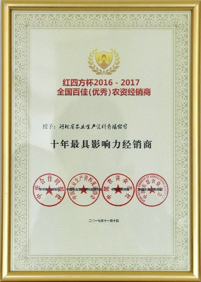 公司榮獲全國百佳(優(yōu)秀)農(nóng)資經(jīng)銷商 “十年最具影響力經(jīng)銷商”稱號