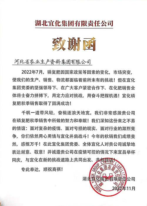 本網(wǎng)訊 近日,湖北宜化集團有限責任公司向集團公司發(fā)來致謝函,對雙方良好的合作表示高度肯定,對集團公司在疫情和市場形勢的雙重壓力下對湖北宜化的大力支持表示衷心地感謝。作為河北省農(nóng)資流通領域的龍頭企業(yè),河北省農(nóng)資集團今后將與湖北宜化集團進一步加強業(yè)務合作,深入拓展合作空間,強強聯(lián)手,互利共贏,共同創(chuàng)造新的輝煌。