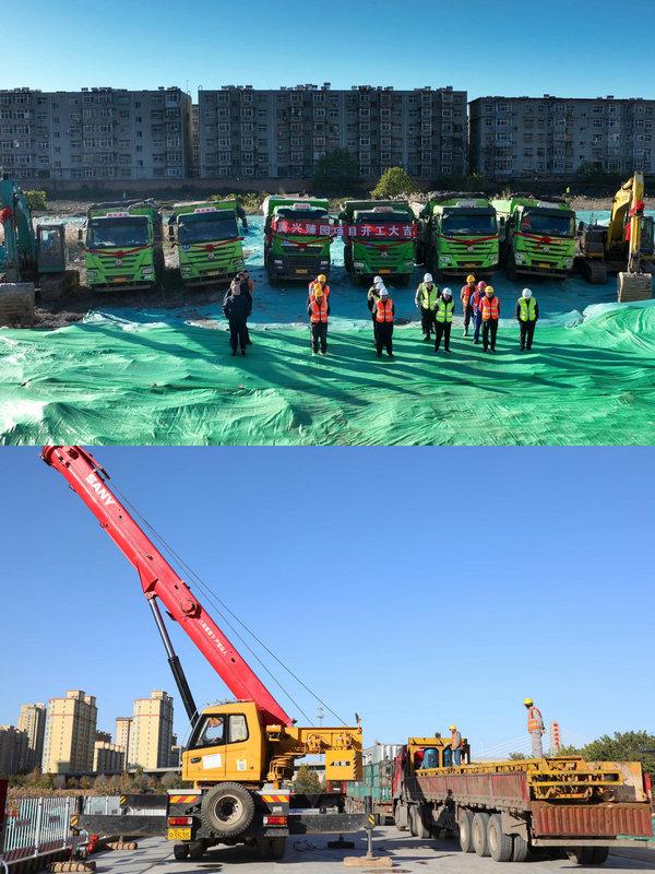 建設現場,機械引擎轟鳴,鉆機高聳入云,運輸車輛整齊劃一,全員蓄勢待發。