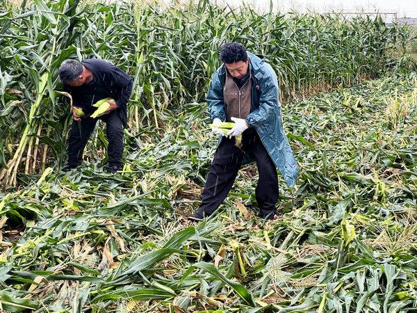 公司種植的400多畝甜玉米如果錯過收獲期,將損失巨大。可雨勢一直未停,田間泥濘不堪,常規(guī)收割機無法作業(yè),豐安公司經理劉佳緊急調度了幾臺“四不像”拖拉機及裝載機,全體員工冒雨下地,搶收作業(yè)。有些低洼地塊連拖拉機也進不去,劉佳帶領劉磊、石峰、化立成、王繼唯、張海森等員工,跳進齊膝的泥水里,一穗一穗地徒手掰下,再深一腳淺一腳地肩扛手提運到地頭。雨水混著汗水,衣服沾滿泥漿,每個人都在拼盡全力,只為多搶回一穗玉米,保護豐收果實。