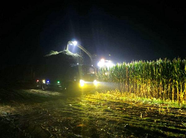 青貯作業(yè)地塊大、時間緊,搶收同樣面臨挑戰(zhàn)。為趕在雨歇窗口期完成搶收,豐安團隊決定晝夜不息、連續(xù)作戰(zhàn),實行全天候輪班。劉佳天不亮就帶頭下地,劉磊、高朋、王繼唯深夜在田間協(xié)調機械、清理地塊,大家餓了就在田埂上扒幾口盒飯,困了就在駕駛室里輪流瞇一會兒,忙到凌晨三點結束工作。與此同時,王立威、張紅同樣全力以赴,從清晨6點持續(xù)奮戰(zhàn)至次日凌晨2點,不停地過磅統(tǒng)計,收款調度,期間經手車輛達1000余輛,確保運輸有序、賬目清晰。