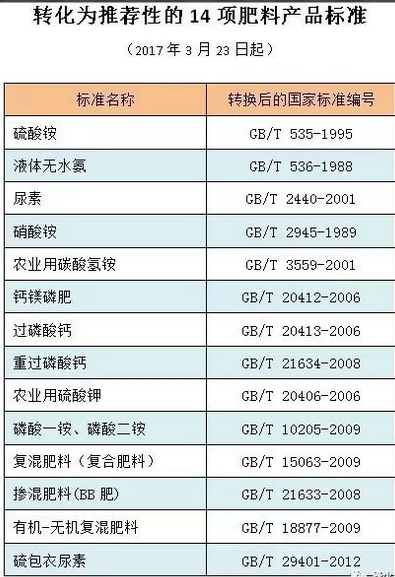 2017年3月23日,國家質量監督檢驗檢疫總局、國家標準化管理委員會聯合發布公告,將1077項強制性國家標準轉化為推薦性國家標準。其中,涉及尿素、磷酸銨、硫酸銨等14項肥料產品國家標準。